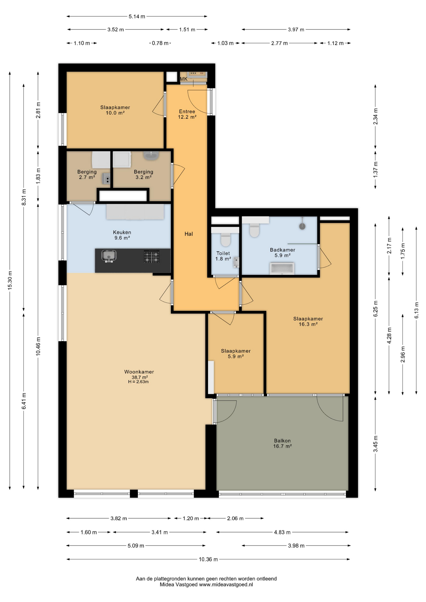- derde slaapkamer aan voorzijde (6 m²)
