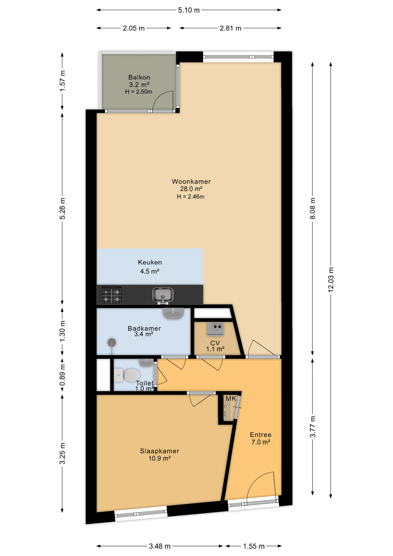 U betreedt het appartement via een ruime entree met meterkast. Vanuit hier heeft u toegang tot de lichte woonkamer van circa 28 m², waar de grote raampartijen zorgen voor een prettige lichtinval. Vanuit de woonkamer bereikt u het balkon van circa 3 m², gelegen op het zuidwesten, waar u heerlijk van de zon kunt genieten. De open keuken is praktisch ingedeeld en voorzien van een vaatwasser, losse koel-vriescombinatie, gasstel, oven en afzuigkap.