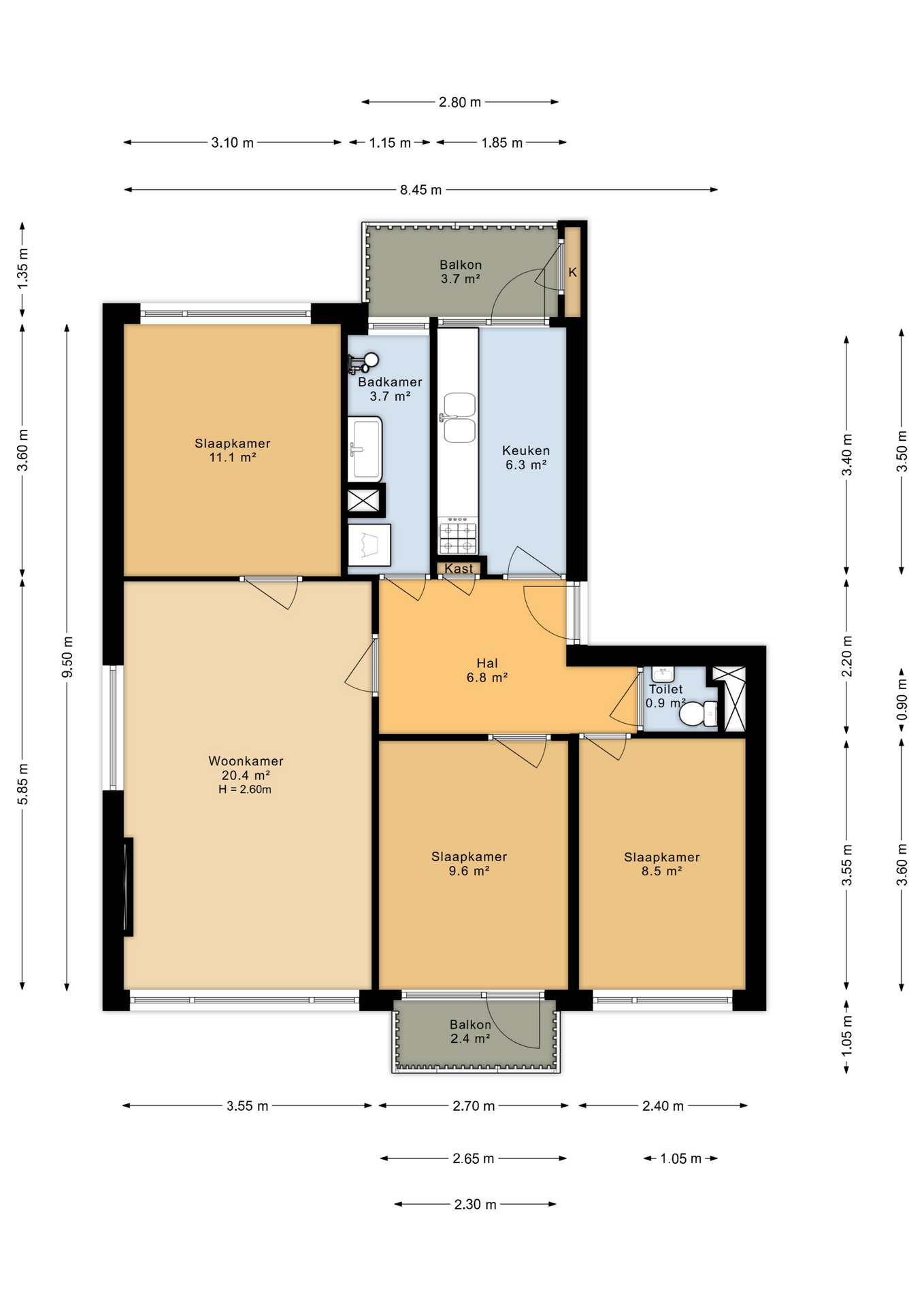 De woonkamer is heerlijk licht dankzij de ligging op het zuidwesten. Hier is voldoende ruimte voor een comfortabele zithoek en eethoek. Vanuit de hal zijn de drie slaapkamers bereikbaar, waarvan één ook uitstekend kan dienen als werkruimte of hobbykamer. De dichte keuken heeft een loopdeur naar het balkon en beschikt over een handige bergkast. De badkamer is voorzien van een wastafelmeubel en douche. Daarnaast is er een separaat toilet met fonteintje.